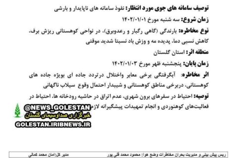 هواشناسی گلستان در اطلاعیهای درباره احتمال وقوع سیلاب ناگهانی و آبگرفتگی برخی معابر در این استان هشدار داد. بر اساس این اطلاعیه؛ بارندگی، ریزش برف